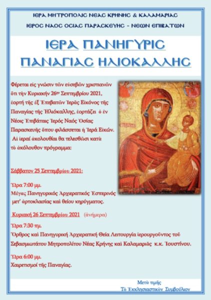 22/09/2021 22/09/2021 Την Κυριακή 26 Σεπτεμβρίου 2021 εορτάζει η Ιερά Εικόνα της Παναγίας της Ηλιόκαλλης, της εξ Επιβατών. Την παραμονή της εορτής, 25/09, θα τελεσθεί ο Πανηγυρικός Αρχιερατικός Εσπερινός μετ’ αρτοκλασίας και θείου κηρύγματος, στον Ιερό Ναό της Οσίας Παρασκευής, στους Νέους Επιβάτες Θεσσαλονίκης, όπου και φυλάσσεται η Ιερά Εικόνα. Ανήμερα, 26 Σεπτεμβρίου και ώρα 7:30 π.μ....