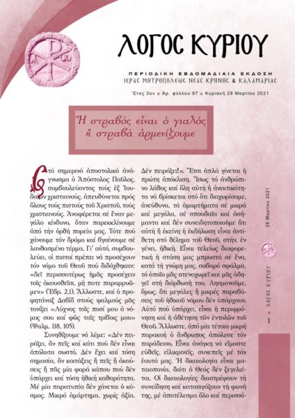 27/03/2021 27/03/2021 Με αφορμή το αυριανό αποστολικό ανάγνωσμα (Κυριακής 28 Μαρτίου, Β’ νηστειών), ο Αρχιμανδρίτης της Ιεράς Μητροπόλεως Νέας Κρήνης και Καλαμαριάς π. Βασίλειος Πολίτης, μας καλεί να μη συμβιβαζόμαστε με το κακό, να μη διαχωρίζουμε τα σφάλματα σε μικρά και μεγάλα, να μη λέμε «δεν πειράζει» σε περιπτώσεις μικρών αποκλίσεων από την Ορθόδοξη πίστη και τις...