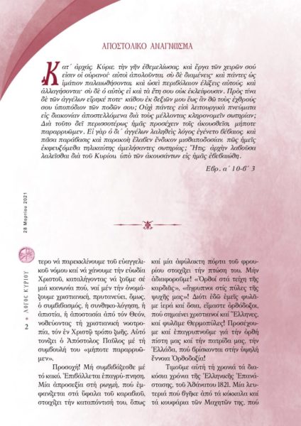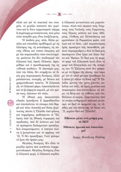 Ακόμα εκφράζει -με αφορμή τη νόσο που ταλαιπωρεί τον πλανήτη, τους προβληματισμούς του σχετικά για τη Δύση που βρίσκεται στη… δύση της και μας παροτρύνει να αφήσουμε τον στείρο πολιτικό ρεαλισμό και να ξαναβρούμε το όραμα, την πίστη και την ελπίδα, για να κάνουμε ένα νέο ’21!