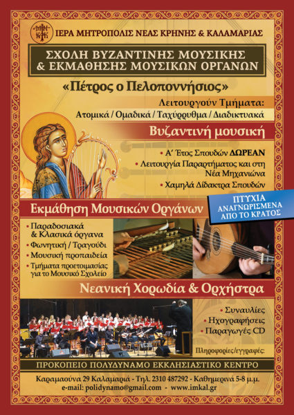 Από την Ιερά Μητρόπολη Νέας Κρήνης και Καλαμαριάς ανακοινώθηκε ότι ξεκίνησαν οι εγγραφές φοίτησης στην αναγνωρισμένη από το Κράτος Σχολή Βυζαντινής Μουσικής και Μουσικών Οργάνων. Λειτουργούν τμήματα εκμάθησης Βυζαντινής μουσικής, κλασικών και παραδοσιακών οργάνων όπως: βιολί, κανονάκι, ποντιακή λύρα, κρουστά, πνευστά, πιάνο, κιθάρα, φωνητική, τραγούδι και μουσική προπαιδεία.