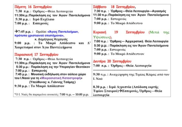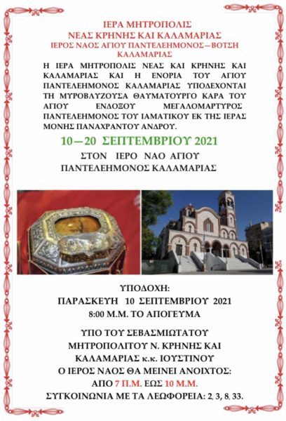 08/09/2021 08/09/2021 Η ενορία του Αγίου Παντελεήμονος στο Βότση Καλαμαριάς, θα υποδεχθεί την Κάρα του Αγίου Ενδόξου Μεγαλομάρτυρος Παντελεήμονος, το απόγευμα της Παρασκευής 10 Σεπτεμβρίου στις 8:00μ.μ., υπό την παρουσία του Σεβασμιωτάτου Μητροπολίτη Νέας Κρήνης και Καλαμαριάς κ. Ιουστίνου. Στη συνέχεια θα ακολουθήσει ιερά αγρυπνία όπου και θα χοροστατήσει ο Μητροπολίτης. Η Κάρα του Αγίου Ιαματικού Παντελεήμονος...