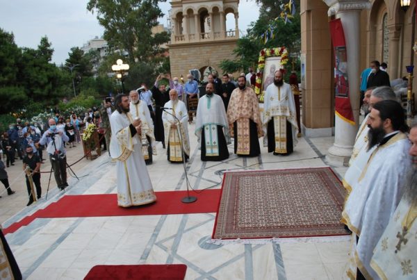 Μεθεόρτιος Εσπερινός εψάλη στον αύλειο χώρο του Μητροπολιτκού Ναού της Αγίας Φωτεινής Νέας Σμύρνης, όπως και πέρυσι, το απόγευμα της Κυριακής στις 7. Αυτό διευκόλυνε περισσότερο τη συμμετοχή των ενοριτών, αλλά και των πιστών που προσήλθαν από όμορες Ενορίες.