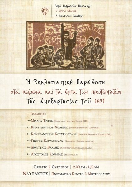 Η Ιερά Μητρόπολη Ναυπάκτου και Αγίου Βλασίου διοργανώνει το Ζ΄ Θεολογικό Συνέδριό της, στο Πνευματικό της Κέντρο, στην Ναύπακτο, το Σάββατο 2 Οκτωβρίου 2021, με γενικό θέμα: «Η Εκκλησιαστική Παράδοση στα κείμενα και τα έργα των Πρωτεργατών της Ανεξαρτησίας του 1821».