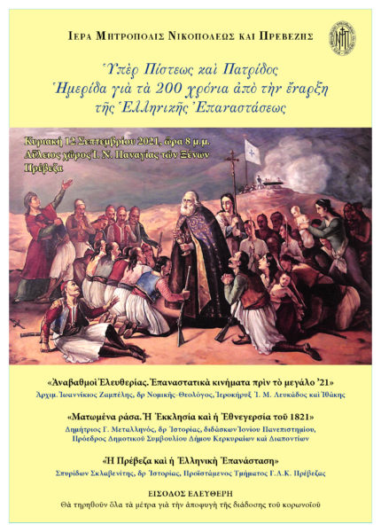 Η Ιερά Μητρόπολη Νικοπόλεως και Πρεβέζης διοργανώνει ημερίδα αφιερωμένη στα 200 χρόνια από την έναρξη της Ελληνικής Επανάστασης με τίτλο «Υπέρ Πίστεως και Πατρίδος». Η ημερίδα πραγματοποιείται σήμερα, Κυριακή 12 Σεπτεμβρίου, στον αύλιο χώρο του Iερού Ναού της Παναγίας των Ξένων με ώρα έναρξης 8 μ.μ.