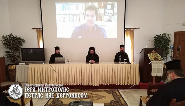 Μετά το πέρας της Θείας Λειτουργίας, πραγματοποιήθηκε στην Αίθουσα του Εκκλησιαστικού Πνευματικού Κέντρου του Ιερού Μητροπολιτικού Ναού Μεγάλης Παναγίας διαδικτυακή ημερίδα για τον Πατριάρχη Γρηγόριο Ε΄, τηρουμένων των πρωτοκόλλων υγιεινής και προστασίας που είναι επιβεβλημένα για τον περιορισμό της εξάπλωσης της πανδημίας.