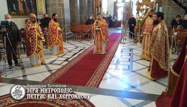 Τον Θείο Λόγο κήρυξε ο Πανοσιολ. Αρχιμ. Ευγένιος Καρακωνσταντάκης, Γραφεύς της Ιεράς Επαρχιακής Συνόδου της Εκκλησίας Κρήτης. Ο π. Ευγένιος ανεφέρθη στην προσωπικότητα και το αγωνιστικό φρόνημα του Εθνομάρτυρος Πατριάρχου Γρηγορίου Ε΄ κατά την έκρηξη της Ελληνικής Επανάστασης, λέγοντας: «Όπως περιγράφει ο ανιψιός-βιογράφος του, ο Γρηγόριος ήταν «περί τήν τροφήν ὀλιγαρκής καί ἀσκητικός. Πλήρης δέ ὤν τῆς θείας ἀγάπης, ὑπῆρχεν ἀκάματος καί εἰς τόν ἱερόν ἀγῶνα τῆς προσευχῆς. Τήν προσευχήν εἶχε καί τροφήν καί τρυφήν τῆς φιλοθέου ψυχῆς αὐτοῦ καί ὁδηγόν εἰς τά πρακτέα καί σύντροφον εἰς τούς ἀγῶνας τῶν πατριαρχικῶν μεριμνῶν». Ήταν κοσμημένος με πολλές αρετές ακόμα· την ελεημοσύνη, την πραότητα, την τιμιότητα. Μνημονεύονται πολλά περιστατικά για την παροιμιώδη αγάπη που επεδείκνυε σε όποιον είχε ανάγκη.