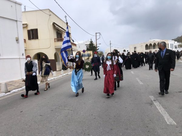Ευθύς αμέσως, προπορευομένων των μαθητικών αντιπροσωπειών όλων των σχολείων της πόλεως, ο Σεβασμιώτατος, συνοδευόμενος από τον Ιερό Κλήρο, τους τοπικούς και λοιπούς άρχοντες της νήσου, μετέβησαν στο Ηρώο της πόλεως, όπου τελέσθηκε Επιμνημόσυνη Δέηση, υπέρ των ηρωϊκώς αγωνισαμένων και ενδόξως πεσόντων, κατά την εθνική παλιγγενεσία μας, στο τέλος της οποίας, αφού πραγματοποιήθηκε η κατάθεση στεφάνων, ενός λεπτού σιγή και η ανάκρουση του Εθνικού Ύμνου, ο κ. Δημήτρης Σκουλάτος, Διευθυντής του ΓΕ.Λ. Νάξου «Μανώλης Γλέζος», εκφώνησε τον πανηγυρικό της ημέρας.