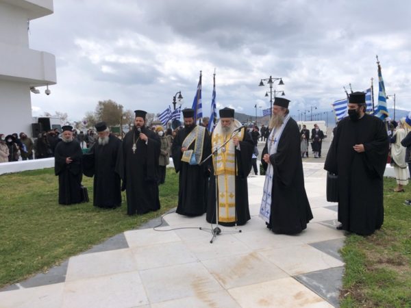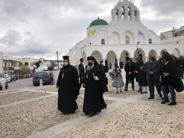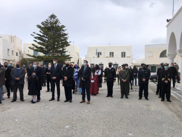 Ευθύς αμέσως, προπορευομένων των μαθητικών αντιπροσωπειών όλων των σχολείων της πόλεως, ο Σεβασμιώτατος, συνοδευόμενος από τον Ιερό Κλήρο, τους τοπικούς και λοιπούς άρχοντες της νήσου, μετέβησαν στο Ηρώο της πόλεως, όπου τελέσθηκε Επιμνημόσυνη Δέηση, υπέρ των ηρωϊκώς αγωνισαμένων και ενδόξως πεσόντων, κατά την εθνική παλιγγενεσία μας, στο τέλος της οποίας, αφού πραγματοποιήθηκε η κατάθεση στεφάνων, ενός λεπτού σιγή και η ανάκρουση του Εθνικού Ύμνου, ο κ. Δημήτρης Σκουλάτος, Διευθυντής του ΓΕ.Λ. Νάξου «Μανώλης Γλέζος», εκφώνησε τον πανηγυρικό της ημέρας.