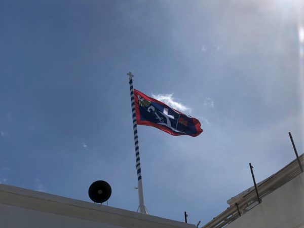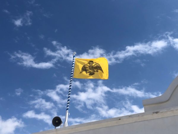 Εν συνεχεία, κλήρος και λαός, μετέβησαν στον αύλειο χώρο του Ιερού Ναού όπου πραγματοποιήθηκε η έπαρση των γνωστοτέρων σημαιών της Επαναστάσεως, οι οποίες (όλες ανεξαιρέτως) έχουν κοινό χαρακτηριστικό και κεντρικό στοιχείο τους τον Τίμιο Σταυρό. Ακολούθησε το εμβατήριο της σημαίας και η ανάκρουση του Εθνικού Ύμνου.