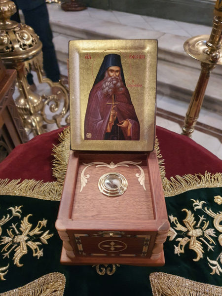 Στο κέντρο του Ιερού Ναού ετοποθετήθη προς προσκύνηση και ευλογία, η ιερά του Οσίου εικών και απότμημα εκ του Ιερού αυτού Λειψάνου.