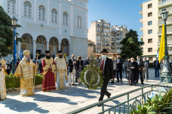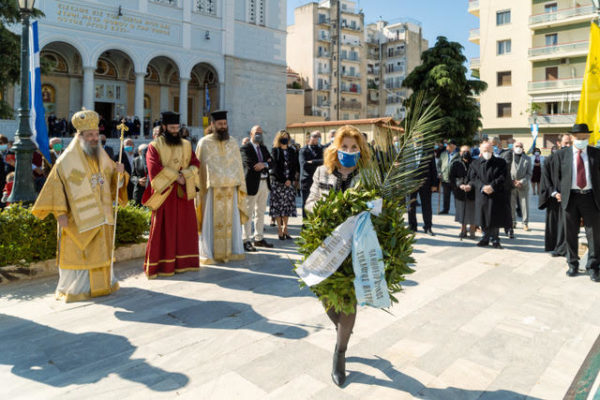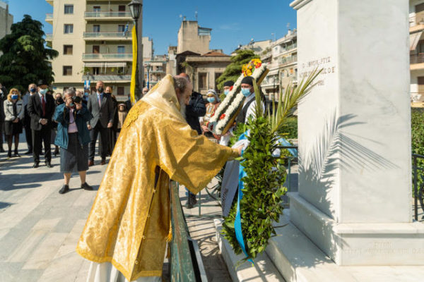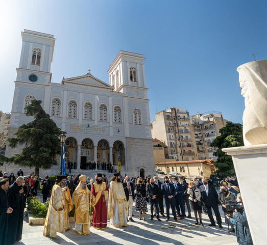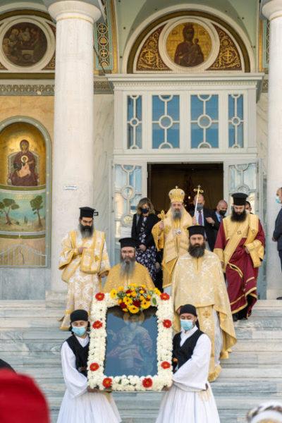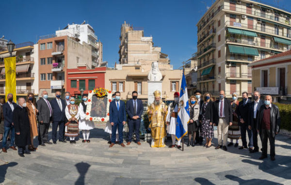 Μετά το πέρας της Θείας Λειτουργίας και την ομιλία του Σεβασμιωτάτου, λιτανεύτηκε, από τον Ναό έως την προτομή του Εθνάρχου Ιερομάρτυρος Πατριάρχου, η ιερά Εικόνα του, ανεπέμφθη δέησις και κατετέθησαν στέφανοι από τους Εκπροσώπους της Περιφέρειας, του Δήμου, του Επιμελητηρίου Αχαίας, τους Προέδρους των Συλλόγων των εν Πάτραις Γορτυνίων και Αρκάδων και άλλους Εκπροσώπους τοπικών Αρχών και Φορέων.