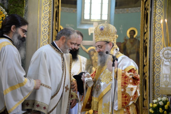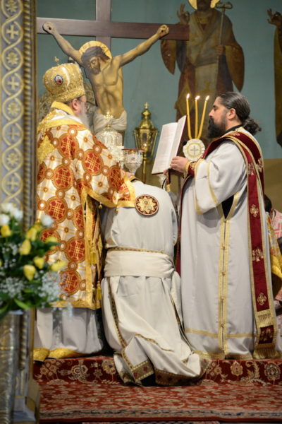 Ανήμερα, ο Σεβασμιώτατος εχοροστάτησε στον Όρθρο, στον πανηγυρίζοντα περίλαμπρο της Παντανάσσης Ναό και ετέλεσε την Θεία Λειτουργία, τελέσας και το Μυστήριο της εις Διάκονον χειροτονίας του ευλαβεστάτου Νικολάου Μανιάτη, Ιεροψάλτου, ο οποίος αφυπηρέτησε από την εργασία του στον ΟΤΕ και προσεφέρθη, να υπηρετήση ως Κληρικός την αγία μας Εκκλησία.