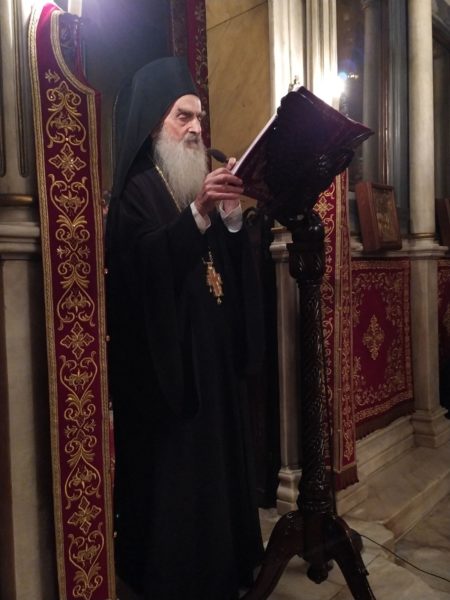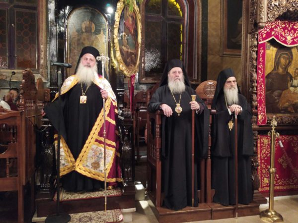 Στον πανηγυρικό Εσπερινό χοροστάτησε ο Σεβασμιώτατος Μητροπολίτης Κανάγκας κ. Θεοδόσιος, αδελφός της Ιεράς Μονής Γηροκομητίσσης, συγχοροστατούντος του Θεοφιλεστάτου Επισκόπου Κερνίτσης κ. Χρυσάνθου.