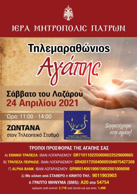 Τηλεμαραθώνιο αγάπης διοργανώνει η Ιερά Μητρόπολη Πατρών το Σάββατο του Λαζάρου (24 Απριλίου) από τις 11.00 έως τις 14.00, ενόψει, φυσικά, του Πάσχα και με έναν ακόμη λόγο για να το κάνει, αφού η υγειονομική κρίση ταλανίζει πολλούς συνανθρώπους μας και σε οικονομικό επίπεδο.