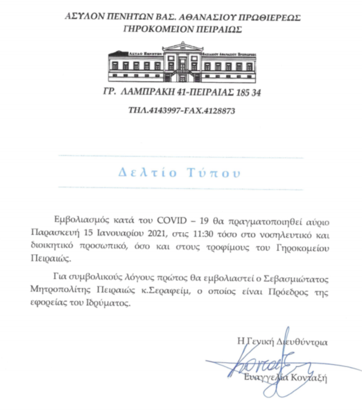 Εμβολιασμός κατά του COVID – 19 θα πραγματοποιηθεί την Παρασκευή 15 Ιανουαρίου 2021, στις 11:30, τόσο στο νοσηλευτικό και διοικητικό προσωπικό όσο και στους τροφίμους του Γηροκομείου Πειραιώς. Για συμβολικούς λόγους, πρώτος θα εμβολιαστεί ο Σεβασμιώτατος Μητροπολίτης Πειραιώς κ.Σεραφείμ, ο οποίος είναι Πρόεδρος της εφορείας του Ιδρύματος.