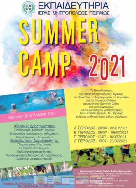 Τα εκπαιδευτήρια της Ιεράς Μητροπόλεως Πειραιώς, διοργανώνουν και αυτό το καλοκαίρι θερινό πρόγραμμα με αθλητικές και εκπαιδευτικές δραστηριότητες αναψυχής για παιδιά ηλικίας 6 έως 14 ετών, πάντοτε με ασφάλεια και τηρώντας όλα τα απαραίτητα υγειονομικά πρωτόκολλα.