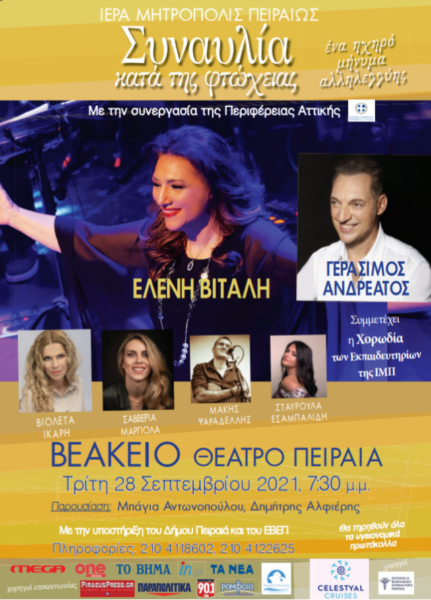 Η Ιερά Μητρόπολη Πειραιώς σε συνεργασία με την Περιφέρεια Αττικής και την υποστήριξη του Δήμου Πειραιά και του Ε.Β.Ε.Π., διοργανώνει μεγάλη φιλανθρωπική Εκδήλωση – Συναυλία, στις 28 Σεπτεμβρίου 2021, ημέρα Τρίτη, στις 19:30 στο Βεάκειο ανοιχτό Θέατρο Πειραιά, με την Ελένη Βιτάλη, τον Γεράσιμο Ανδρεάτο και τους Βιολέτα Ίκαρη, Σαββέρια Μαργιολά, Μάκη Ψαραδέλη και Σταυρούλα Εσαμπαλίδη, για να αφυπνίσει τους πολίτες της ευρύτερης περιοχής της περιφέρειάς μας, σχετικά με το δράμα που βιώνουν πολλοί συνάνθρωποί μας.