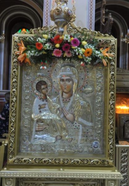 Στην συνέχεια αναφερόμενος στην ενθρόνιση, προ λίγων ετών, αντιγράφου της Ιεράς Εικόνος της Παναγίας Τριχερούσης στον Μητροπολιτικό Ιερό Ναό των Αγίων Κωνσταντίνου και Ελένης Πειραιώς, επεσήμανε πως «η Παναγιά δέχτηκε και εκείνη πρόσκληση πολύ πιο μεγαλειοδεστέρα από τη δική μας. Να γίνει το όχημα δια του οποίου θα έρθει ο Θεός στην ιστορία».