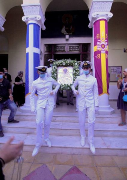Προ της Απολύσεως πραγματοποιήθηκε σύντομη περιφορά της Ιεράς Εικόνος του Αγίου πέριξ του Ναού, χωρίς την συνοδεία πιστών.