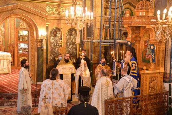 Το Σάββατο 14 Αυγούστου, παραμονή της εορτής, τελέσθηκε ο Μέγας Πανηγυρικός Εσπερινός και εψάλησαν τα Εγκώμια της Υπεραγίας Θεοτόκου, χοροστατούντος του Σεβασμιωτάτου Μητροπολίτου Πειραιώς κ. Σεραφείμ. Ακολούθως, πραγματοποιήθηκε περιμετρικά του Ιερού Ναού, περιφορά του Ιερού Σκηνώματος της Παναγίας, κατά τη διάρκεια της οποίας διαβάστηκε από τον Σεβασμιώτατο ικετήριος δέηση για την κατάπαυση της πανδημίας του κορωνοϊού. Μετά το πέρας του Μεγάλου Εσπερινού, τελέσθηκε η Παράκληση και ακολούθησε Ιερά Αγρυπνία.