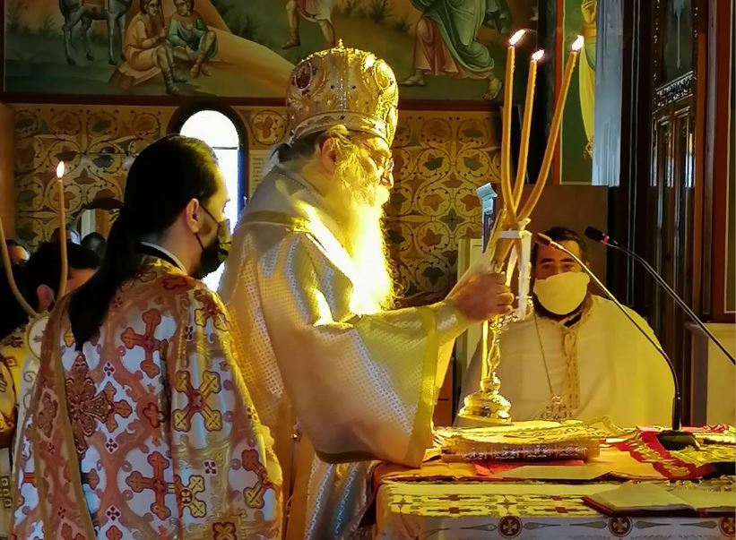 Στο τέλος της Θείας Λειτουργίας στη σύντομη προσλαλιά του απηύθυνε αναστάσιμες πατρικές ευχές στο εκκλησίασμα, ευχήθηκε στον εορτάζοντα διάκονο του Ιερού Ναού και τόνισε χαρακτηριστικά: