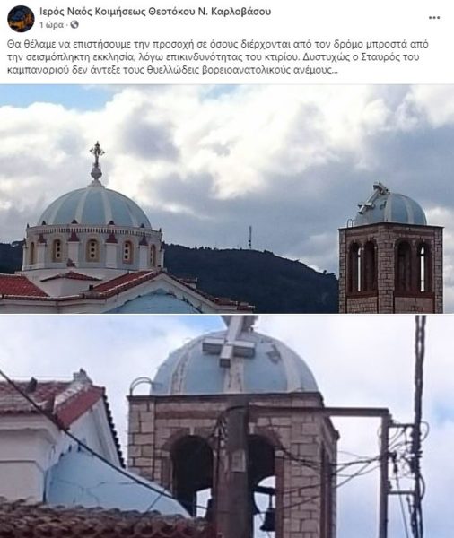 Ο σταυρός του καμπαναριού του Ιερού Ναού Κοιμήσεως της Θεοτόκου Καρλοβάσου, του οποίου μεγάλο τμήμα έχει υποστεί μεγάλες ζημιές από τον φονικό σεισμό της 30ης Οκτωβρίου, δεν άντεξε τους θυελλώδεις βορειοανατολικούς ανέμους που πλήττουν τις τελευταίες ώρες το νησί και κατέρρευσε.