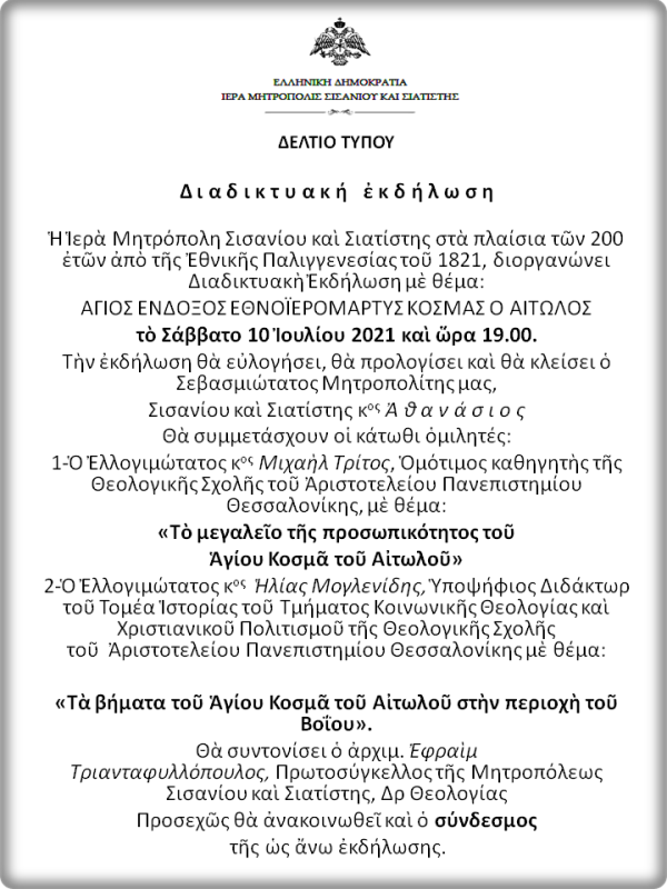 Διαδικτυακή εκδήλωση με θέμα “ΑΓΙΟΣ ΕΝΔΟΞΟΣ ΕΘΝΟΪΕΡΟΜΑΡΤΥΣ ΚΟΣΜΑΣ Ο ΑΙΤΩΛΟΣ” διοργανώνει η Ιερά Μητρόπολη Σισανίου και Σιατίστης στα πλαίσια της επετείου των 200 ετών από την Εθνική Παλιγγγενεσία του 1821, το Σάββατο 10 Ιουλίου 2021 και ώρα 19:00.