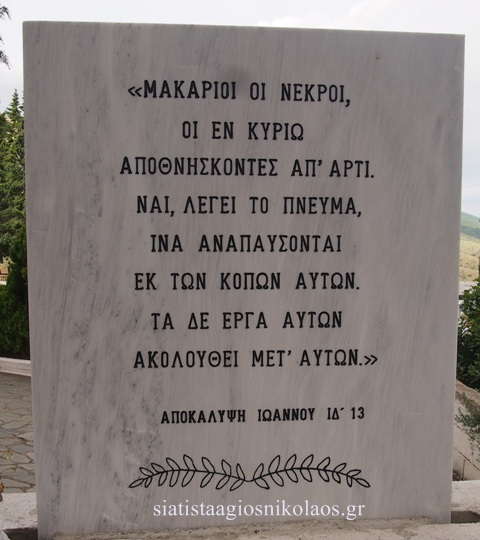Η Εκκλησιαστική Επιτροπή ευχαρίστησε όλους τους ενορίτες, που με πολλή προθυμία διατηρούν τους χώρους του κοιμητηρίου και των οστεοφυλακίων καθαρούς. Στο οστεοφυλάκιο, με τα συρτάρια, από πολύ καιρό γίνεται αγιογράφηση. Όσοι από τους ενορίτες θέλουν να αφιερώσουν κάποια αγιογραφία, μπορούν να απευθύνονται στον προϊστάμενο Ιερέα της Ενορίας.