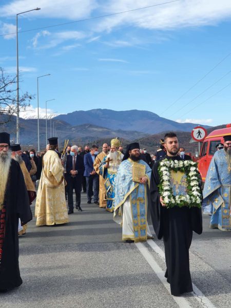 Μετά το πέρας της Θείας Λειτουργίας, ο Σεπτός μας Ποιμενάρχης μετέβη στον Πηνειό ποταμό, όπου τέλεσε την ακολουθία του Αγιασμού των Υδάτων και την ρίψη του Τιμίου Σταυρού στα νερά του θεσσαλικού ποταμού, ευλογώντας με αυτό τον τρόπο την περιφέρεια της Μητροπόλεώς του αλλά και ολόκληρο τον Νομό Τρικάλων και την Θεσσαλία, αφού ο Πηνειός ποταμός διασχίζει μεγάλο μέρος της.