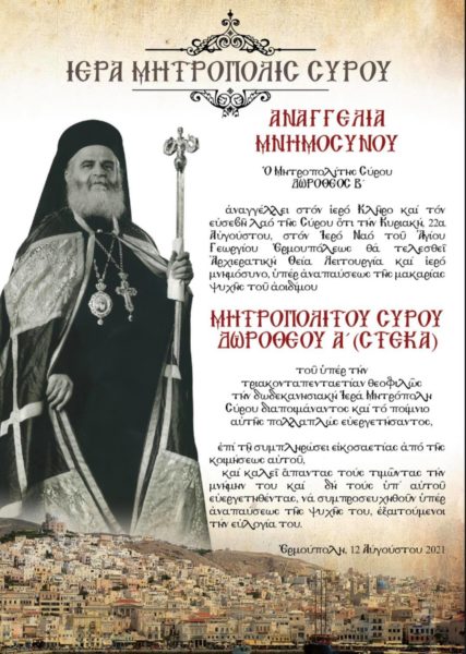 Την Κυριακή 22 Αυγούστου, θα τελεστεί το εικοσαετές Μνημόσυνο του μακαριστού Μητροπολίτη Σύρου κυρού Δωρόθεου Α’ στον Ιερό Ναό Αγίου Γεωργίου Ερμουπόλεως.