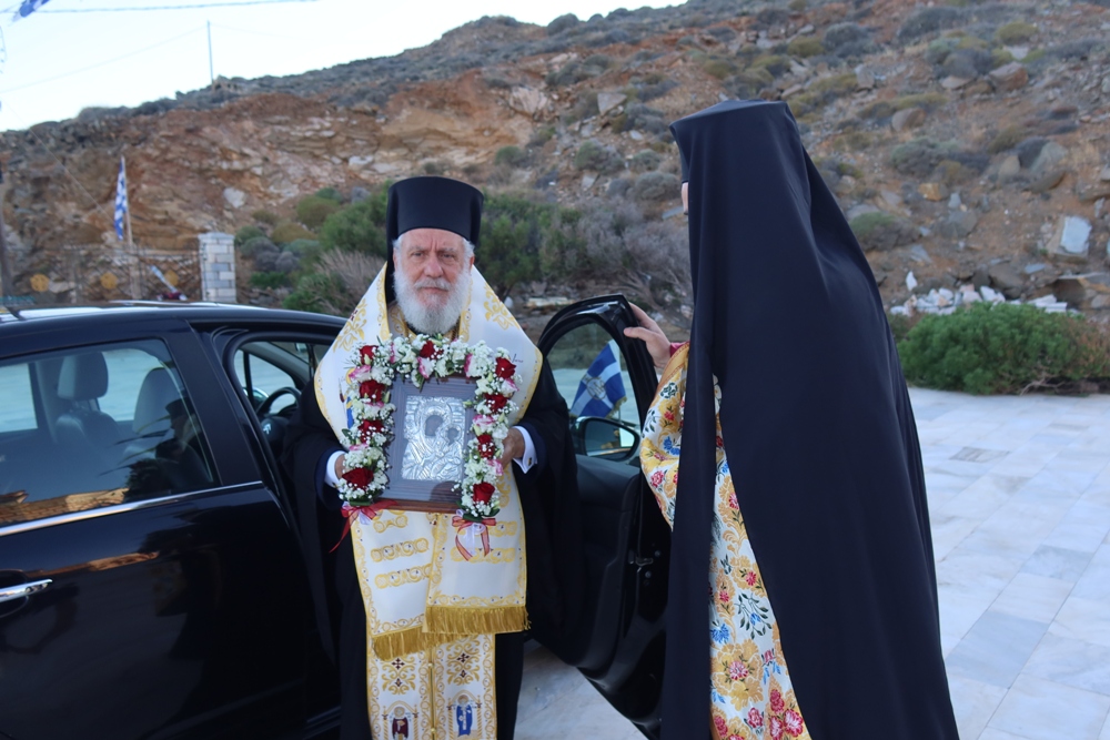 Ευχαρίστησε τον Αρχιερατικό Επίτροπο Τήνου, Πρωτόπρ. Γεώργιος Φανερός, για την πρωτοβουλία και τη μεριμνά του να διακομισθεί στη Σύρο η Εικόνα της Παναγίας «Κυρά-Ξένης», που τόσο ευλαβούνται οι κάτοικοι του Πύργου, του Πανόρμου και της Τήνου ευρύτερα, και κατέληξε λέγων ότι «η άφιξη κσι υποδοχή της Εικόνας της Παναγίας «Κυρά-Ξένης», η επέτειος της Ευρέσεως της Εικόνας του Αγίου Δημητρίου και ο ιαματικός λόγος του Κυρίου προς τον μη έχοντα άνθρωπον να τον βοηθήσει παραλυτικό της αυριανής (σ.σ. σημερινής) Ευαγγελικής περικοπής θα ζυμώσουν το πρόσφορο, που θα τελεστεί η Λειτουργία και αφιερωθεί αύριο (σ.σ. σήμερα) στην Ανάσταση του Κυρίου».