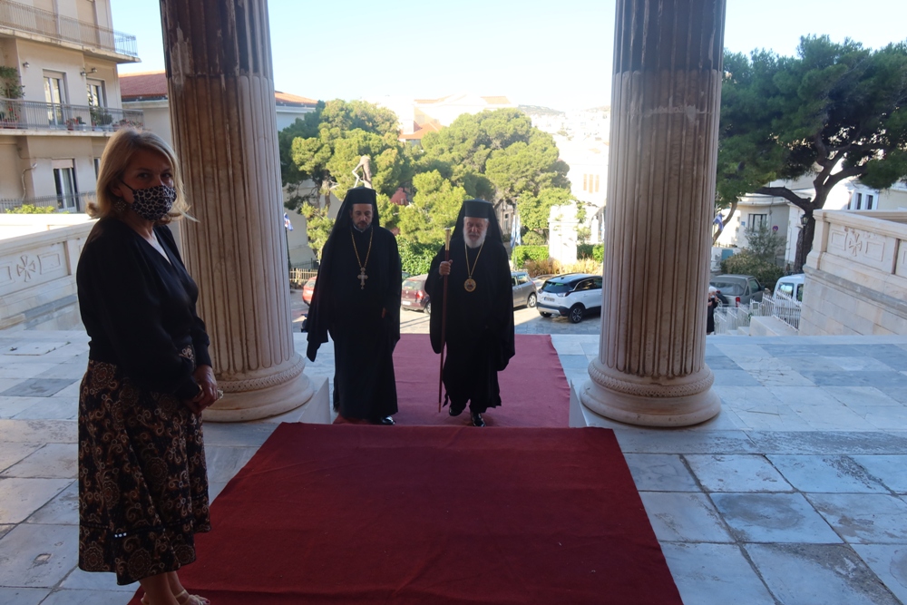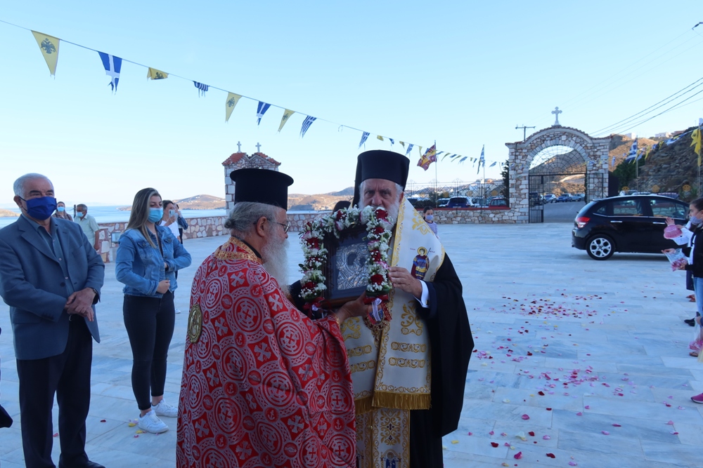 Με την υποδοχή, στον προαύλιο χώρο του Ιερού Ναού Αγίου Δημητρίου, της Ιεράς Εικόνος της Παναγίας «Κυρά-Ξένης», που διεκόμισε το Σάββατο 22 Μαΐου 2021 από το ομώνυμο Προσκύνημα του Πύργου της Τήνου ο Σεβασμιώτατος κ. Δωρόθεος Β’, με ειδική Ακολουθία, που συνέθεσε ο Γραμματέας της Μητροπόλεως κ. Αλέξ. Μαρκουίζος, το τρισάγιο που τέλεσε επί του τάφου του αοιδίμου κτίτορος του Ναού Μητροπολίτου Σύρου Φιλαρέτου (Ιωαννίδη) και τον Αρχιερατικό Εσπερινό που ακολούθησε, οι Σύριοι, τηρούντες τα ισχύοντα υγειονομικά μέτρα, τίμησαν την 85η Επέτειο από την Εύρεση της θαυματουργού Εικόνος του Αγίου Δημητρίου, παρουσία του Θεματικού Αντιπεριφερειάρχη Μεταφορών κ. Μ. Δαδάου, των Προέδρων των Τοπικών Κοινοτήτων Ερμουπόλεως κας Ανθής Χαλκιά και Άνω Σύρου κ. Πέτρου Ραουζαίου, των Δημοτικών Συμβούλων κ.κ. Γιάννη Βρούτση, Αλέξ. Αθανασίου, και Δημ. Κοσμά, του Προέδρου του Συνδέσμου Συριανών κ. Δημ. Βαφία και της διατελεσάσης Δημοτικής Συμβούλου κας Άννας Βαφία.