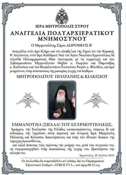 Στον Ιερό Καθεδρικό Ναό του Αγίου Νικολάου Ερμουπόλεως, τη Κυριακή 8 Αυγούστου, θα τελεσθεί Πολυαρχιερατική Θεία Λειτουργία και μνημόσυνο, υπέρ αναπαύσεως της μακαρίας ψυχής του αοιδίμου μητροπολίτου Πολυανής και Κιλκισίου κυρού Εμμανουήλ (Σιγάλα) του εξ Ερμουπόλεως.