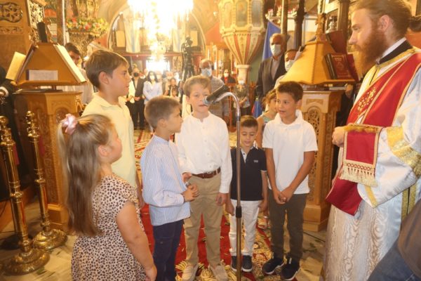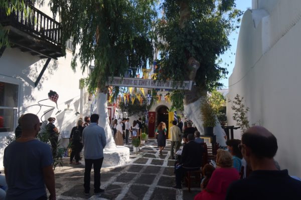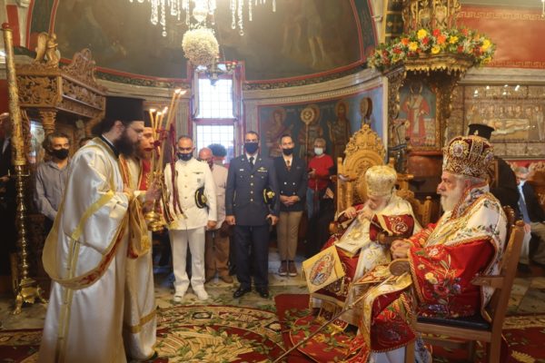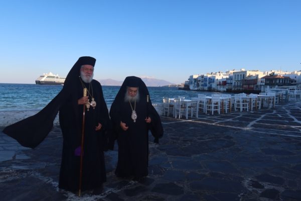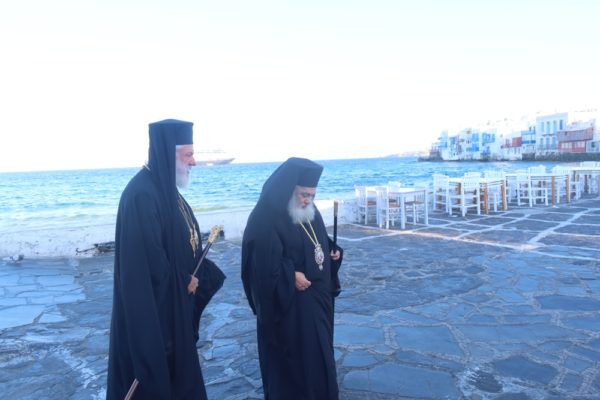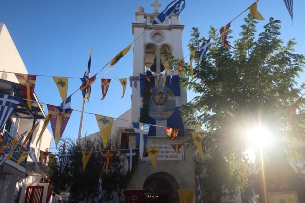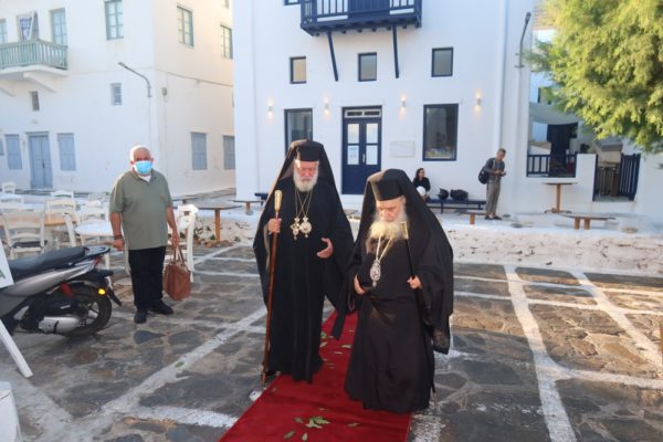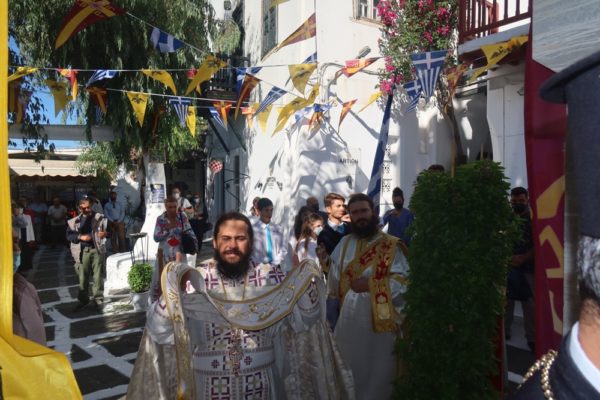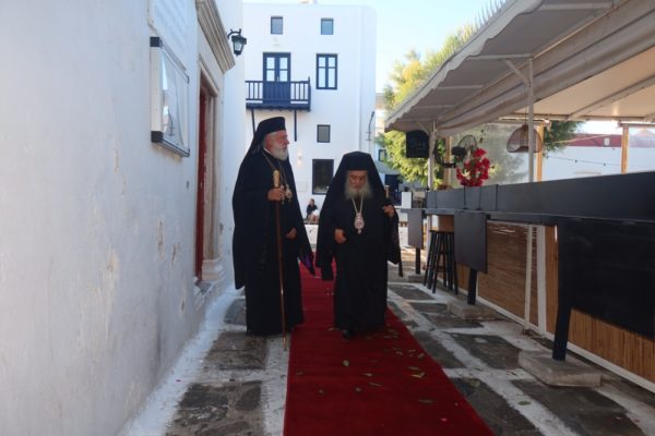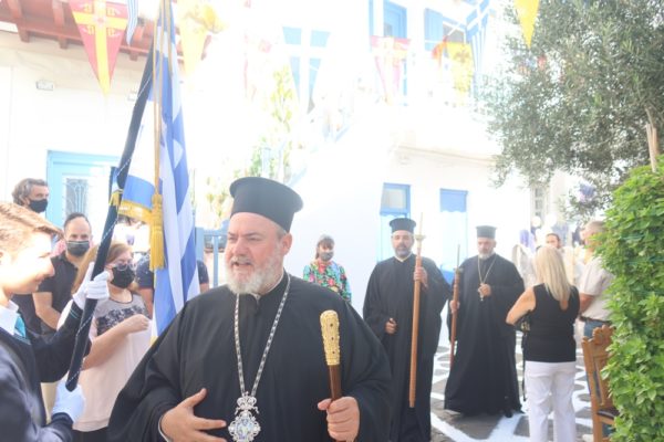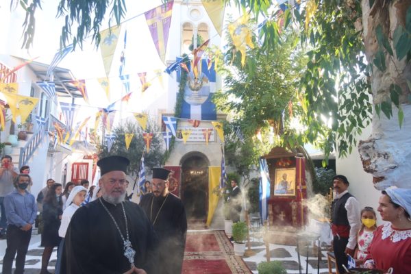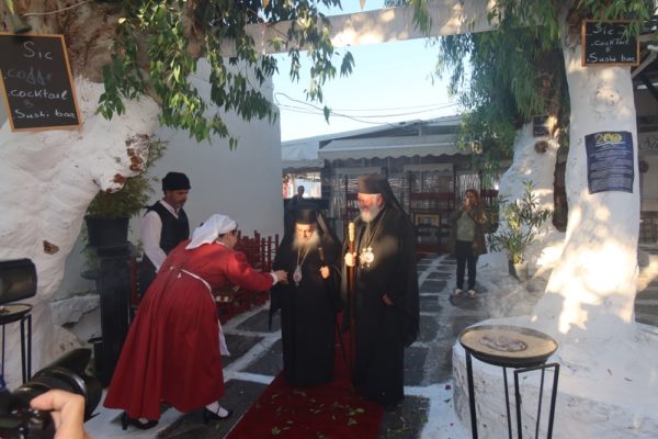 Να σημειωθεί ότι τους Σεβασμιωτάτους Μητροπολίτες Ιωήλ και Δωρόθεο Β’ υπεδέχθησαν κατά την προσέλευσή τους στο Ναό, ο οποίος ήταν διακοσμημένος με ιδιόρρυθμο εθνικό και θρησκευτικό στολισμό, υπεδέχθησαν παιδιά του Πολιτιστικού Συλλόγου « Μαντώ», μαθητές των Ιδιωτικών Εκπαιδευτηρίων της Μυκόνου με τις σημαίες τους, μέλη του συλλόγου Κρητών Μυκόνου και άντρες της Ελληνικής Αστυνομίας, τους οποίους, όλους, ευχαρίστησε ο Σεβασμιώτατος κ. Δωρόθεος Β’.