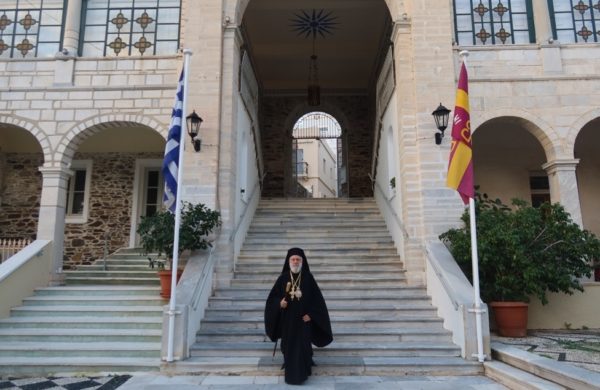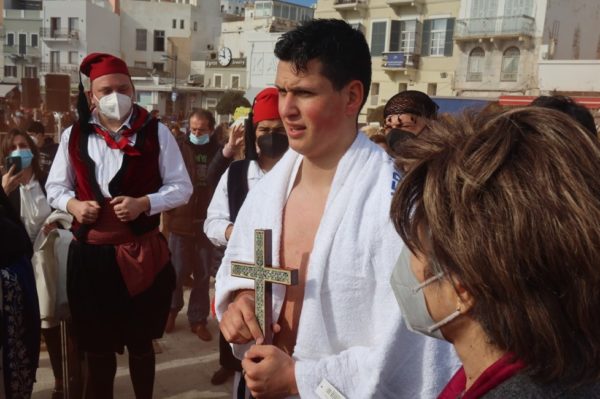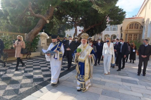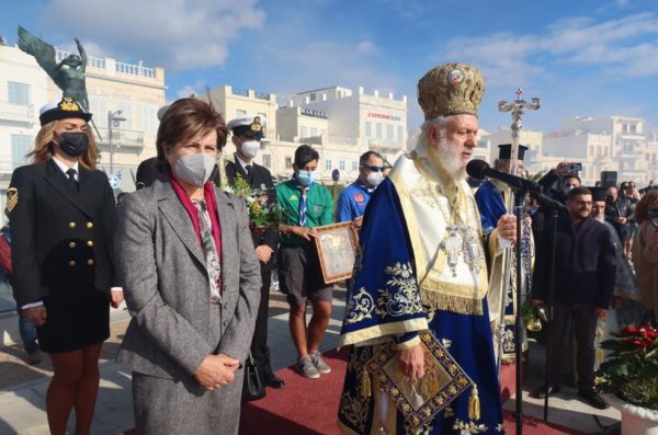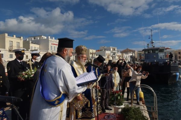 Εκεί, ο Σεβασμιωτατος, επιβαίνων σκάφους του Λιμενικού Σώματος, από την πλώρη, μαζί με την εκπρόσωπο της Κυβερνήσεως, αφού απηύθυνε προς το συγκεντρωμένο πλήθος των Συριανών σύντομη χαιρετιστήρια και ευχετήρια προσλαλιά, ευχηθείς “όπως είναι σήμερα η ημέρα αυτή φωτόλουστη και ολοφώτεινη, ζεσταίνοντας τις καρδιές μας μέσα στην καρδιά του χειμώνα, έτσι να φωτιστεί και η πατρίδα μας και να λυτρωθεί από κάθε κίνδυνο και κάθε φονικό ιό», έρριψε το Σταυρό στη θάλασσα, τον οποίο έσπευσαν να ανασύρουν τολμηροί νέοι, η δε εκπρόσωπος της Κυβέρνησης κα Χριστιάννα Καλογήρου άφησε να πετάξει συμβολικά ένα περιστέρι, ευχηθείσα «Ειρήνη στο Αιγαίο».