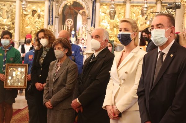 Η Θεία Λειτουργία έγινε παρουσία της εκπροσωπούσης την κυβέρνηση και τον Εξοχώτατο κ. Πρωθυπουργό, Γ. Γραμματέως Αγροτικής Ανάπτυξης και Τροφίμων κα Χριστιάννας Καλογήρου, της Βουλευτού Κυκλάδων κας Αικατερίνης Μονογυιού, του Δημάρχου Σύρου-Ερμούπολης κ Νικολάου Λειβαδάρα, του Θεματικού Αντιπεριφερειάρχη Μεταφορών κ. Δαδάου, του Εισαγγελέως Εφετών Αιγαίου, της διατελεσάσης Γ. Γραμματέως Τουρισμού κας Β. Λοΐζου, Περιφερειακών και Δημοτικών Συμβούλων, του Διοικητή Φρουράς Σύρου, του Διοικητή της 6ης Περιφέρειας Λιμενικού Σώματος, του Λιμενάρχη Σύρου, του Διευθυντή Κυκλαδων Αστυνομίας Ν.Αιγαίου, του Διεθυντή Α.Τ. Ερμούπολης, των Διευθυντών και Προϊσταμένων της Πυροσβεστικής, του Στατολογικού Γραφείου Κυκλάδων, Αξιωματικών των Σωμάτων Ασφαλειας και του Στρατού, Διακαστικών και Εκπαιδευτικών Λειτουργών, του Προϊσταμένου της Αθμιας Εκπαίδευσης, του Διοικητού της Ακαδημίας Εμπορικού Ναυτικού και Σπουδαστών, του Υποδιοικητού της ΠΝΒ Σύρου, νέων του Λυκείου Ελληνίδων, Προσκόπων και πολλών πιστών.