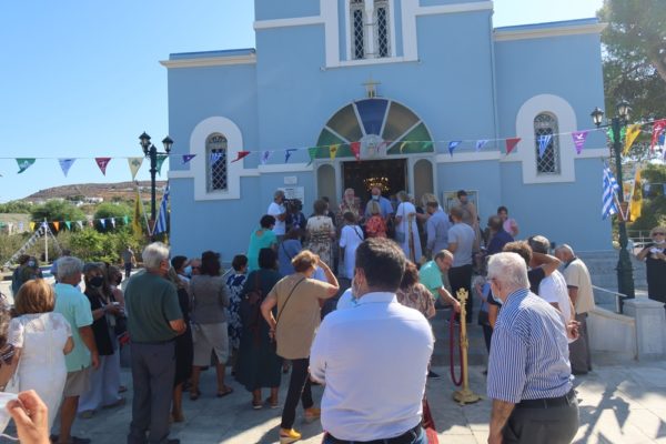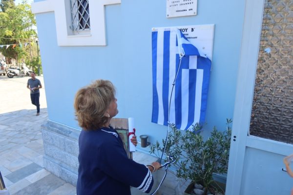 Μετά το πέρας της Θείας Λειτουργίας, η οποία ανεμεταδόθη απ’ ευθείας από τον Περιφερειακό Τηλεοπτικό Σταθμό “SYROS TV1”, η Ευεργέτις του Ναού κ. Ζαφειρία Λαυρεντιάδη απεκάλυψε αναμνηστική πλάκα για την ανακαίνιση του Ιερού Ναού, στην ολοκλήρωση της οποίας η ιδία καθοριστικά συνέβαλε και προς την οποία ο Σεβασμιώτατος κ. Δωρόθεος Β’ επέδωσε την Ευαρέσκεια της Ιεράς Μητροπόλεως.