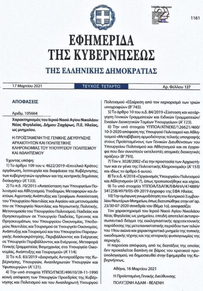 Ο Ιερός Ναός του Αγίου Νικολάου Νέας Φιγαλείας χαρακτηρίστηκε με ΦΕΚ που δημοσιεύτηκε στις 17 Μαρτίου 2021 ως μνημείο.