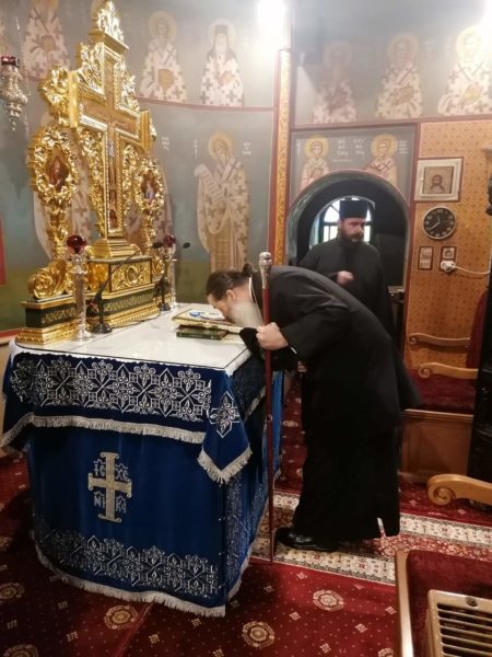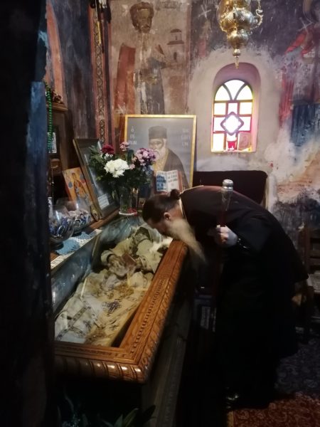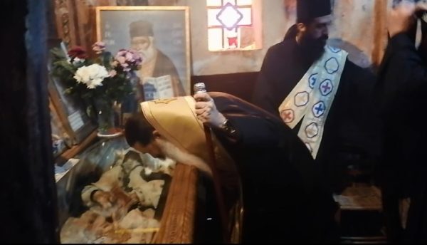 Ο Μητροπολίτης γονατιστός στο ιερό σκήνωμα του Γέροντα Βησσαρίωνα