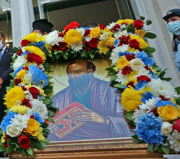 «Το απόγευμα της Δευτέρας 28.06.2021 εψάλη ο πανηγυρικός Πολυαρχιερατικός Εσπερινός και ακολούθησε «Πεζοπορεία στα βήματα του Αποστόλου Παύλου» (αντί της καθιερωμένης λιτανείας, λόγω των σχετικών απαγορεύσεων της πραγματοποιήσεως πομπής εκτός των χώρων λατρείας και αφού έμεινε αναπάντητο από τον αρμόδιο Υπουργό κ. Χαρδαλιά σχετικό αίτημα που υπέβαλαν εγκαίρως η Αντιπεριφέρεια Καβάλας, ο Δήμος Καβάλας και η Ιερά Μητρόπολη Φιλίππων, Νεαπόλεως και Θάσου για την χορήγηση κατ΄ εξαίρεση αδείας πραγματοποιήσεως της πομπής) μέχρι το Μνημείο της αφίξεως του Αποστόλου Παύλου παρά τον λιμένα της αρχαίας Νεαπόλεως (σημερινής Καβάλας) και παραπλεύρως του ιερού Ναού Αγίου Νικολάου της κεντρικής αγοράς, όπου τελέσθηκε υπαιθρίως η αρτοκλασία έμπροσθεν της μαρμαρίνης και ψηφιδογραφημένης αναθηματικής κόγχης. Τιμητική συνοδεία της ιεράς Εικόνος ο ιερός Κλήρος με επικεφαλής τον Σεβασμιώτατο κ. Στέφανο, ο Δήμαρχος Καβάλας κ. Θεόδωρος Μουριάδης και ο Αντιπεριφεριεάρχης Καβάλας κ. Κωνσταντίνος Αντωνιάδης, μαζύ με τους πολυαρίθμους πολίτες και χριστιανούς της τοπικής κοινωνίας.