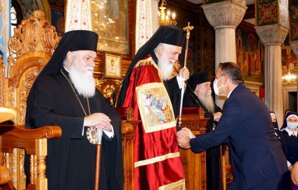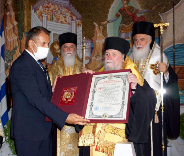 Επί τόπου και προ της απολύσεως ο Σεβ. Μητροπολίτης Φ.Ν.Θ. Στέφανος απένειμε το «Χρυσούν Μετάλλιον του Ιδρυτού της Εκκλησίας των Φιλίππων Αποστόλου Παύλου», συνοδευόμενο και από το σχετικό ευεργετήριο γράμμα, στον συντοπίτη μας εξοχώτατο Υπουργό Εθνικής Αμύνης κ. Νικόλαο Παναγιωτόπουλο, ο οποίος ετίμησε με την παρουσία του, ως εξαιρετικώς τιμώμενο πρόσωπο, τις εορταστικές λατρευτικές συνάξεις και εκδηλώσεις, αποδεχόμενος ευγενώς σχετική πρόσκληση της τοπικής μας Εκκλησίας.