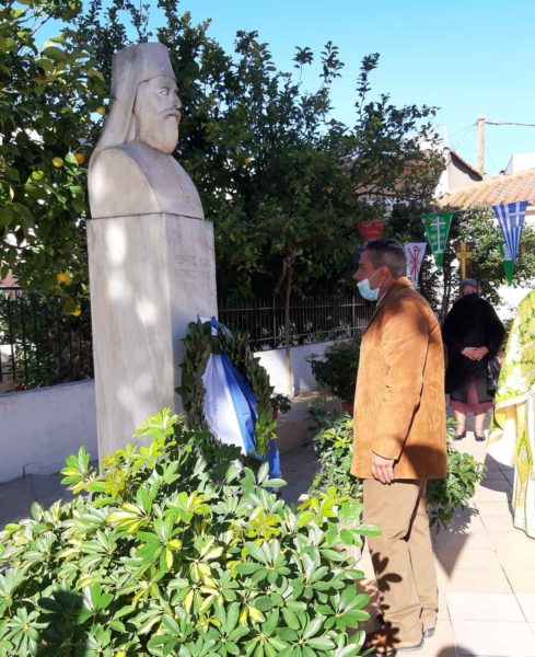 Αμέσως μετά το τελεσθέν μνημόσυνο υπέρ αναπαύσεως της ψυχής του Εθνεγέρτη Ιεράρχη Νεοφύτου, άπαντες, με προεξάρχοντα τον Σεβασμιώτατο ποιμενάρχη μας εξήλθαν στο προαύλιο του Ι. Ναού, όπου ευρίσκεται προτομή του Αρχιεπισκόπου Ευβοίας Νεοφύτου και ο Πρόεδρος της Κοινότητας κ. Τουλούμης κατέθεσε στεφάνι, ως ελάχιστο φόρο τιμής, προς τον ένδοξο γόνο της Πατρίδας μας.