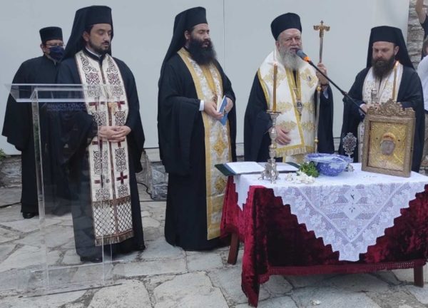 Το απόγευμα της Κυριακής ο Σεβασμιώτατος κ. Χρυσόστομος υποδέχθηκε στην Ιερά Μονή Ευαγγελιστρίας Σκιάθου την Εκπρόσωπο της Κυβερνήσεως κ. Λίνα Μενδώνη-Υπουργό Πολιτισμού, την Υφυπουργό Παιδείας και Θρησκευμάτων κ. Ζέττα Μακρή, τον Βουλευτή Μαγνησίας κ. Χρήστο Μπουκώρο, την Πρόεδρο της Επιτροπής «Ελλάδα 2021» κ. Γιάννα Αγγελοπούλου-Δασκαλάκη, τον Περιφερειάρχη Θεσσαλίας κ. Κωνσταντίνο Αγοραστό, τον Δήμαρχο Θεσσαλονίκης κ. Κωνσταντίνο Ζέρβα, τον Δήμαρχο Σκιάθου κ. Θεόδωρο Τζούμα, την Πρόεδρο και τα μέλη του Δημοτικού Συμβουλίου Σκιάθου εκπροσώπους τοπικών φορέων και κατοίκους της Σκιάθου και τέλεσε τον Αγιασμό της ενάρξεως της ομαδικής εικαστικής έκθεσης που διοργάνωσαν η Περιφέρεια Θεσσαλίας και ο Δήμος Σκιάθου σε συνεργασία με την Επιτροπή «Ελλάδα 2021», με τίτλο «Η πρώτη Σημαία», αφού το Μοναστήρι είναι ο τόπος που φιλοτεχνήθηκε η πρώτη Ελληνική Σημαία το 1807.