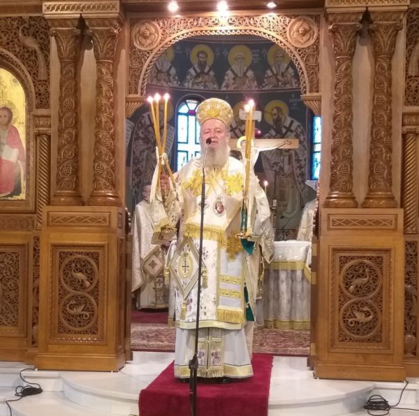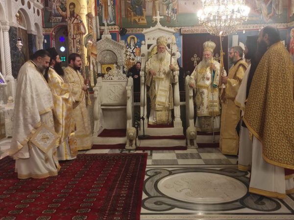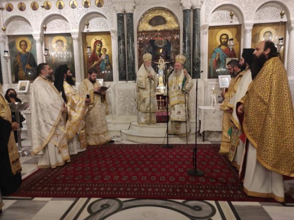 Στην τελεσθείσα εκεί Θεία Λειτουργία προεξήρχε ο Σεβασμιώτατος Κορίνθου, συλλειτουργούντος του Σεβασμιωτάτου Χαλκίδος, συνευχομένων των άλλων δύο Αρχιερέων και συμμετεχόντων Ιερέων και Διακόνων.