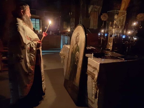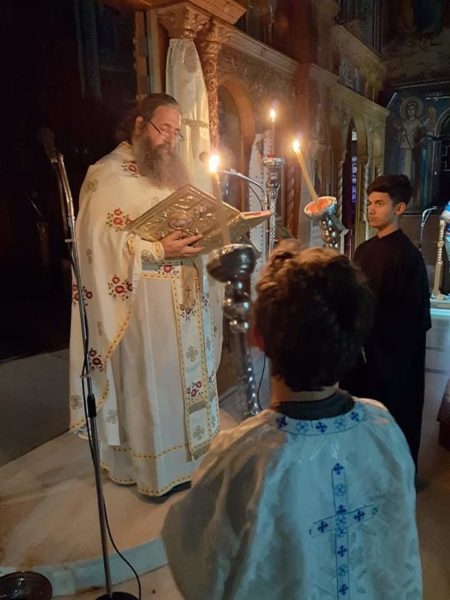 Κατά Ιερά αγρυπνία ιερούργησε ο εφημέριος του ιερού ναού, Οικονόμος π. Κυριακός Κοκκάλας, με τη συμμετοχή των ιεροψαλτών και πιστών της ενορίας, οι οποίοι παρευρέθησαν ιστάμενοι στην ιερά παννυχίδα, τηρουμένων των υγειονομικών διατάξεων.