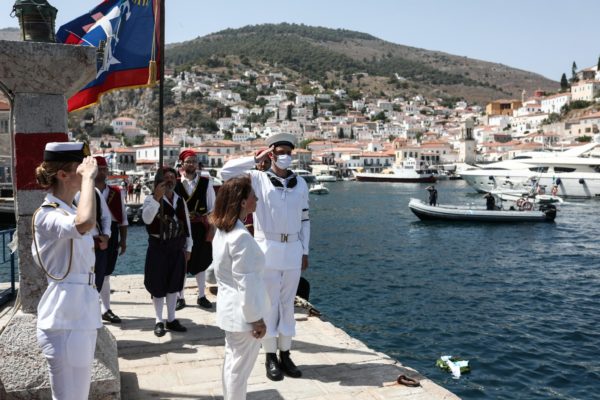 Η επίσκεψη της κυρίας Σακελλαροπούλου ολοκληρώθηκε με τη ρίψη στεφάνου στη θάλασσα προς τιμήν των Ναυμάχων του 1821.