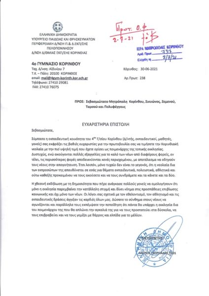 Τις ευχαριστίες και τη βαθιά τους ευγνωμοσύνη εξέφρασαν ο διευθυντής κι οι εκπαιδευτικοί του 4ου Γυμνασίου Κορίνθου προς τον Σεβασμιώτατο οικείο Μητροπολίτη κ. Διονύσιο για την πρωτοβουλία του να τιμήσει την Κορινθιακή νεολαία σε εκδήλωση, που πραγματοποιήθηκε στις 29/6/2021.