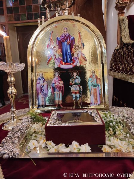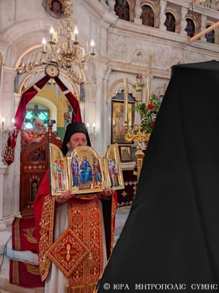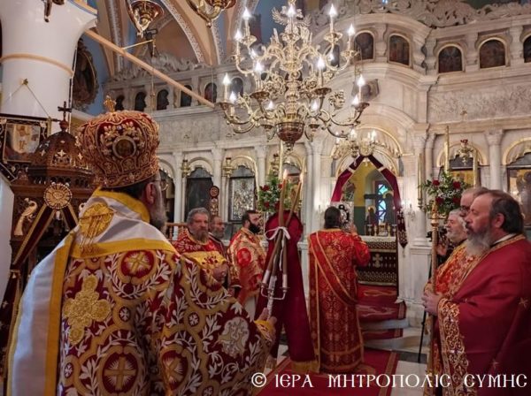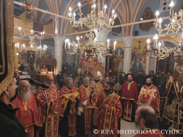 Σήμερα το πρωί (Τρίτης), κυριώνυμο ημέρα της εορτής, ο Σεβ. Μητροπολίτης Σύμης, Τήλου, Χάλκης και Καστελλορίζου κ. Χρυσόστομος χοροστάτησε στον Όρθρο, τέλεσε την Θεία Λειτουργία και ευηγγελίσθη τον θείο λόγο στους πιστούς, έχοντας συλλειτουργούς του τον Πανοσιολ. Καθηγούμενο της Ι. Μονής Πανορμίτου Αρχιμανδρίτη Αντώνιο Πατρό, τον Γεν. Αρχιερατικό Επίτροπο Πρωτοπρ. Στέφανο Μακρή, τον φιλοξενούμενο Γεν. Αρχιερατικό Επίτροπο Καλύμνου Πρωτοπρ. Αμφιλόχιο Σακαλλέρο, τον Εφημέριο του εορτάζοντος Ι. Ναού Οικονόμο Ελευθέριο Οθίτη, τους λοιπούς Εφημερίους της Νήσου και τον Διάκονο Γεώργιο Κακακιό.