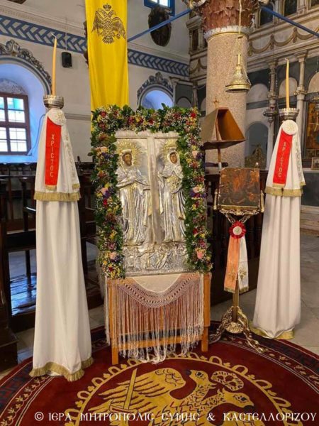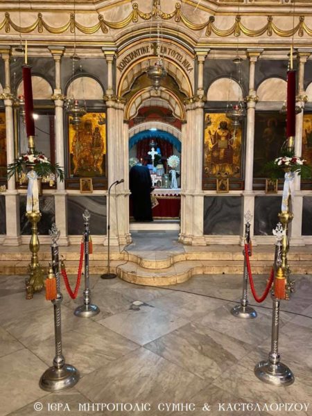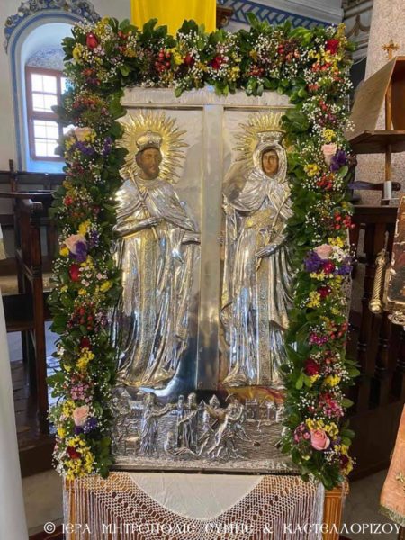 Με την δέουσα εκκλησιαστική τάξη και την λαμπρότητα της Πασχαλίου περιόδου εορτάστηκε στο ακριτικό Καστελλόριζο εν πληθούση Εκκλησία και με τα εν ισχύι υγειονομικά μέτρα για την προστασία της δημόσιας υγείας, η ιερά μνήμη των πολιούχων του Αγίων, Θεοστέπτων Μεγάλων Βασιλέων και Ισαποστόλων Κωνσταντίνου και Ελένης. Οι λατρευτικές εκδηλώσεις είχαν ως επίκεντρο τον πανηγυρίζοντα επ’ ονόματι των Αγίων, τρισυπόστατο, ευμεγέθη και περίλαμπρο Μητροπολιτικό Ναό του Νησιού, η πρόσοψη του οποίου δια την περίσταση, κατεκοσμείτο από την, τεραστίων διαστάσεων, γαλανόλευκη.