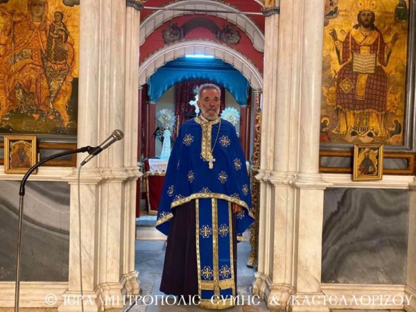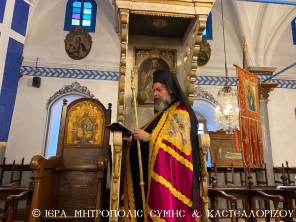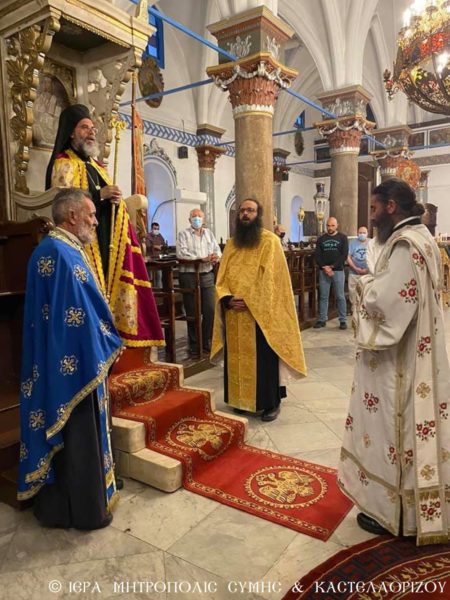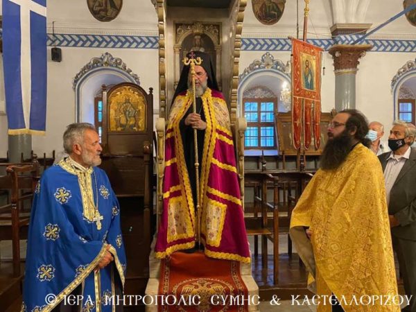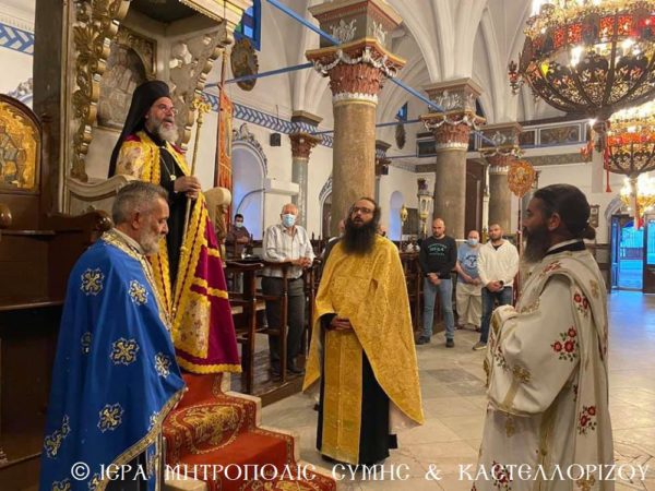 Ο Σεβ. Μητροπολίτης Σύμης, Τήλου, Χάλκης και Καστελλορίζου κ. Χρυσόστομος, προκειμένου να προστή της Ιεράς Πανηγύρεως, μετέβη εχθές παραμονή της εορτής στο ακριτικό νησί, συνοδευόμενος από τον Διάκονο π. Γεώργιο Κακακιό και τους εκ Ρόδου Ιεροψάλτες κ. Παναγιώτη Μανουσάκη, κ. Τσαμπίκο Παπαλέξη και τον Ιατρό κ. Κομνηνό Κουτλινό, οι οποίοι διηκόνησαν μελιρρύτως το ι. Αναλόγιο λαμπρύνοντες έτι περισσότερο την εορτή.